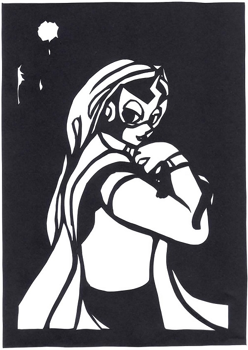 さて、何年振りかのあれこれ、今回は切り絵にしてみました。実はこっそり黒猫がいるんですが、これ、黒猫に見えない気がしてきました(エレキの腕の辺りにいます)全体的に黒々とした感じで、と思って背景を切り抜かずにいたんですが、あんまりにも味気なさ過ぎて、血痕を少し散らしてみたんですが、これも見えない……。相当、エレキさんに気の毒をさせてしまった気がします。もっと派手にしてあげればよかったです。